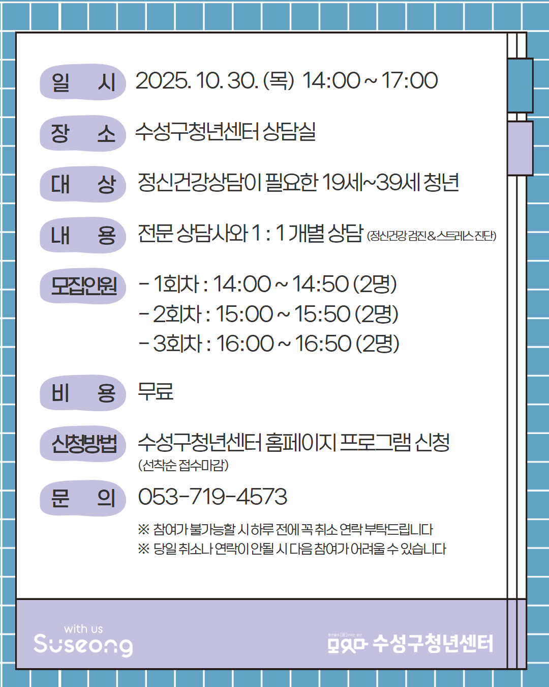 <청년마음상담소> 10월 청년마음건강상담 with 수성구정신건강복지센터