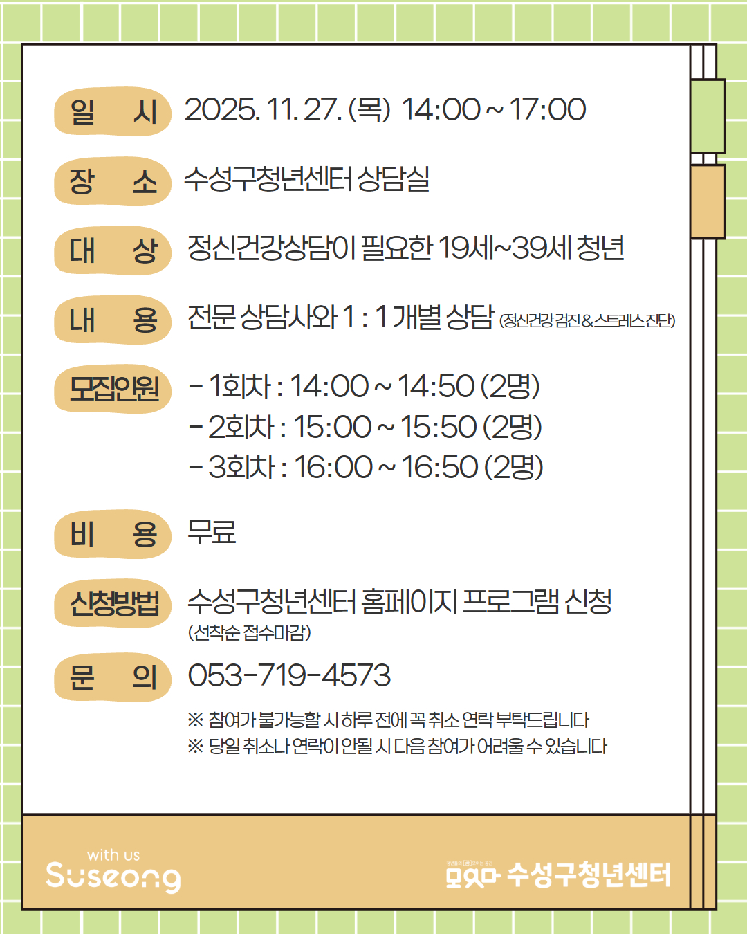 신청 방법 : 수성구청년센터 홈페이지 프로그램 신청 (선착순 접수)