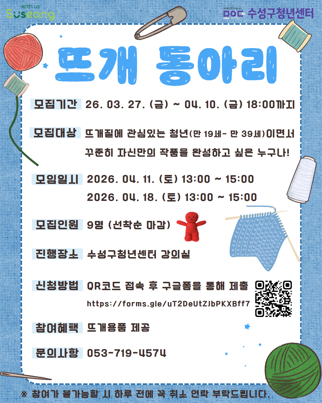 수성구청년센터에서 청년 모임을 위해 뜨개 동아리를 개설하였습니다! - QR코드 접속 혹은 아래 구글폼을 통해 제출 https://forms.gle/GzfLrtrZfXr1SCwy7 |