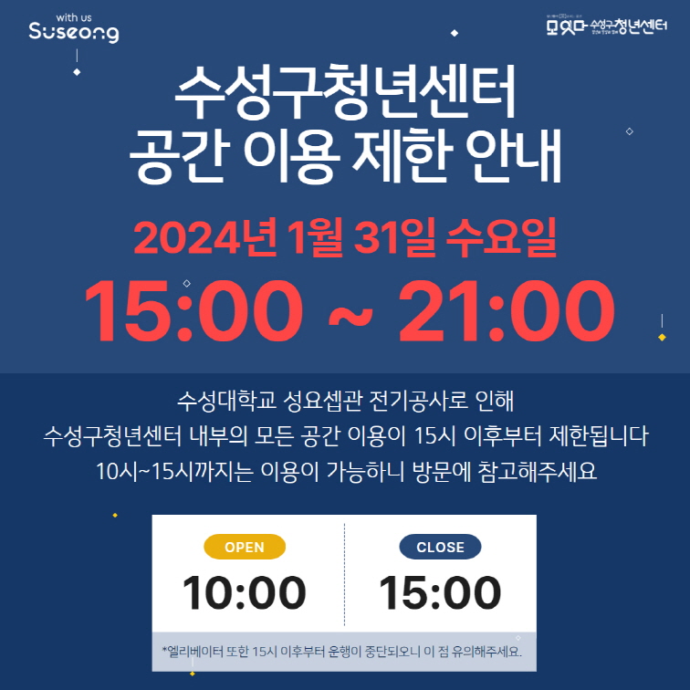 수성구청년센터 내부의 모든 공간 이용이 2024년 1월 31일 수요일 15시 이후부터 제한됩니다.