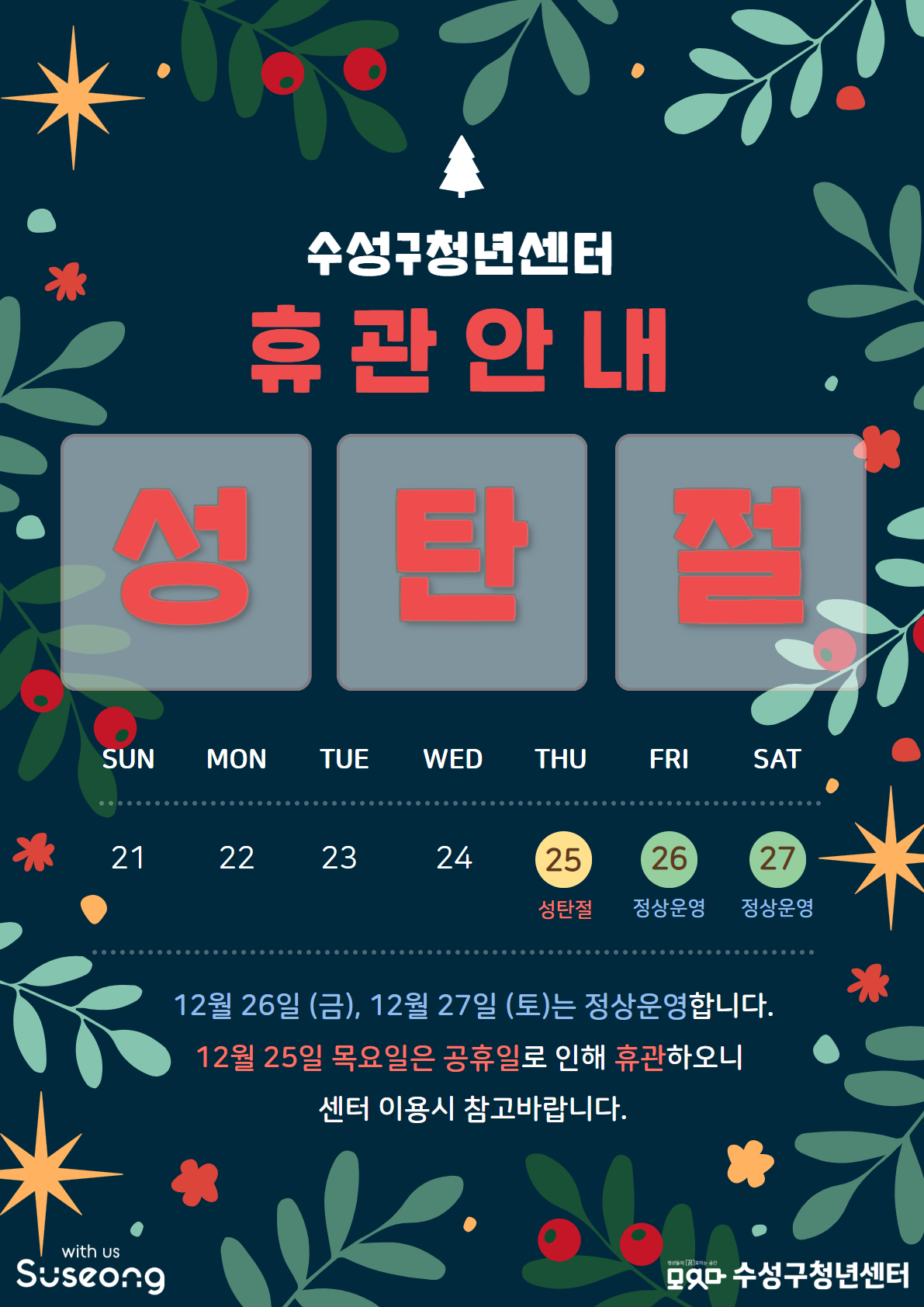 2025년 12월 25일 목요일은 공휴일로 인해 휴관합니다.