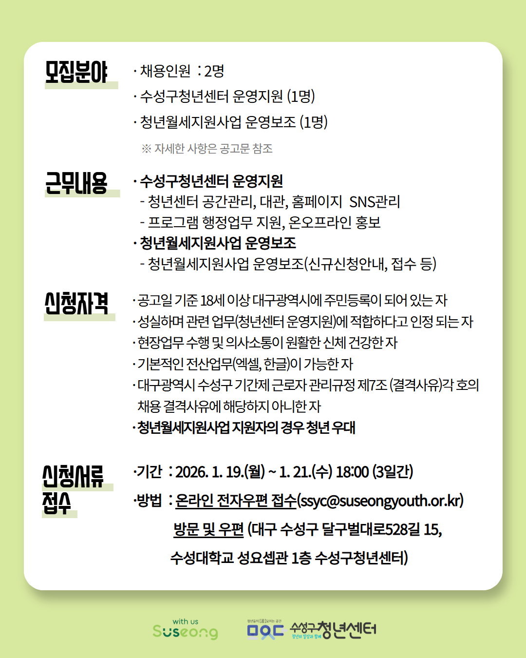 - 수성구청년센터 운영지원 (1명)