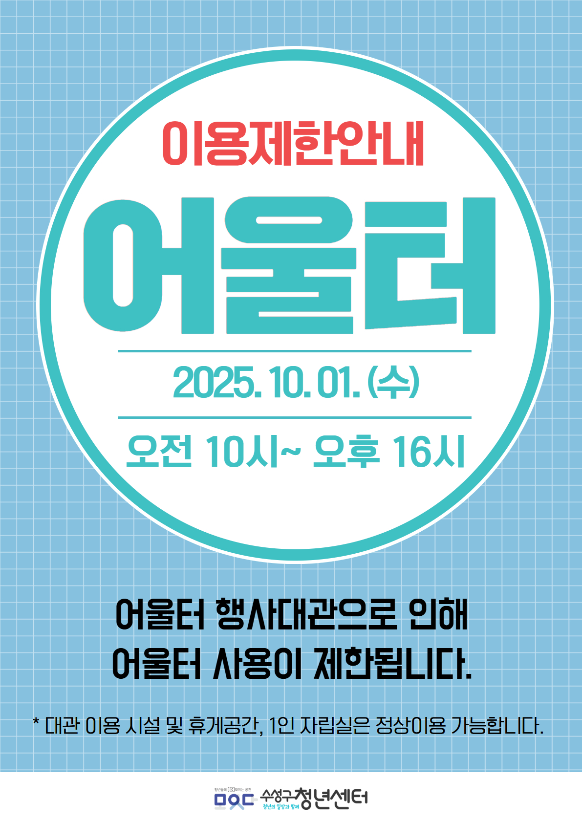 안녕하세요, 수성구청년센터입니다. 어울터 행사대관으로 인해 어울터 사용이 제한됩니다.