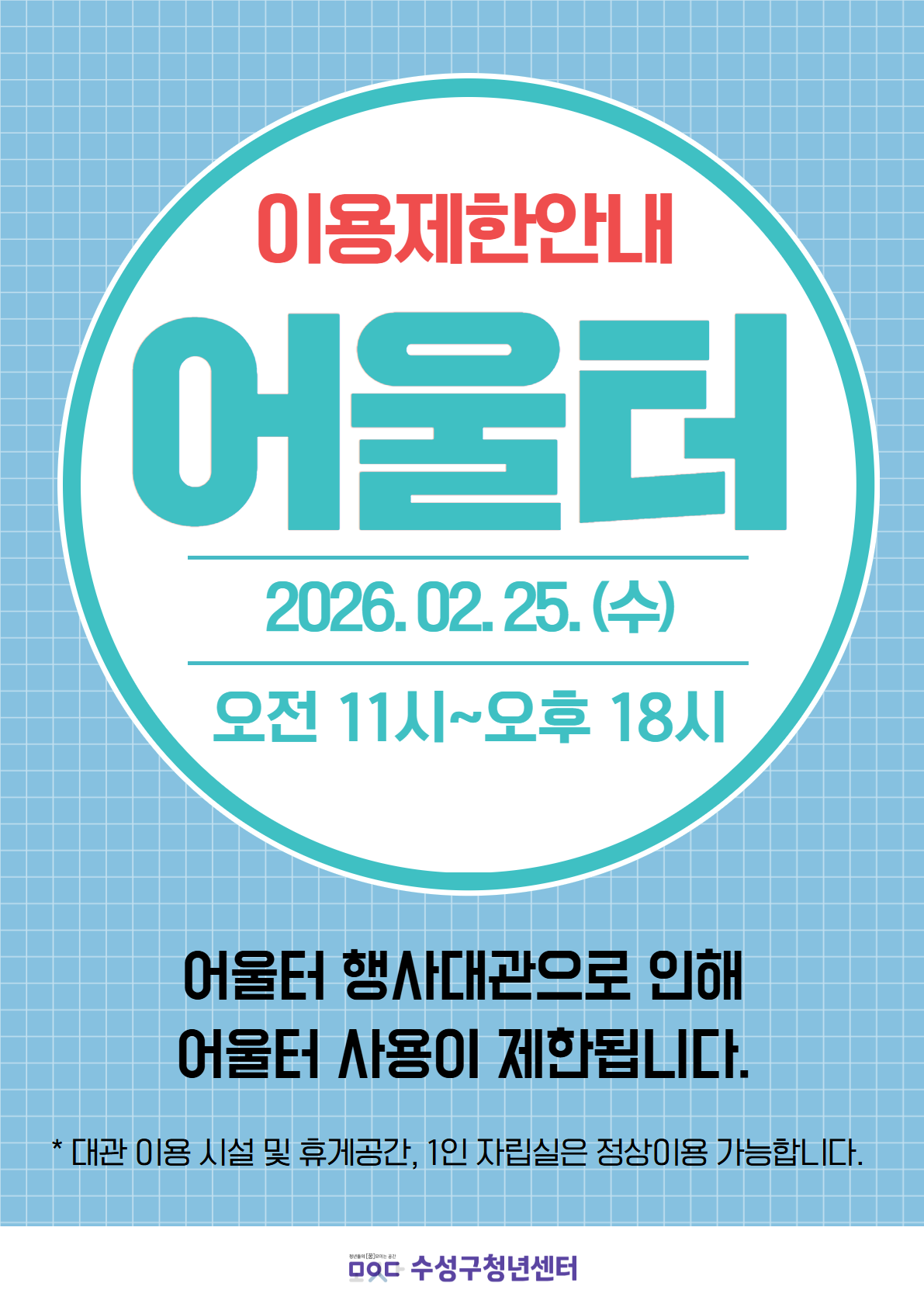 안녕하세요, 수성구청년센터입니다.어울터 행사대관으로 인해 어울터 사용이 제한됩니다.일시 2026년 02월 25일 수요일 오전 11시 ~ 오후 18시*대관이용시...
