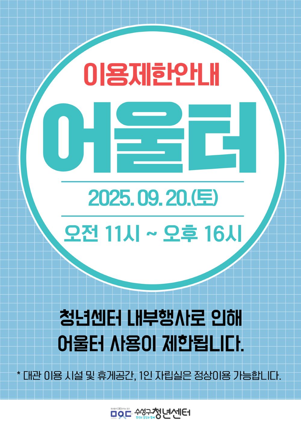 안녕하세요, 수성구청년센터입니다.청년센터 내부행사로 인해 어울터 사용이 제한됩니다. 일시 : 2025년 9월 20일 토요일 오전11시 ~ 오후16시 *대관이...