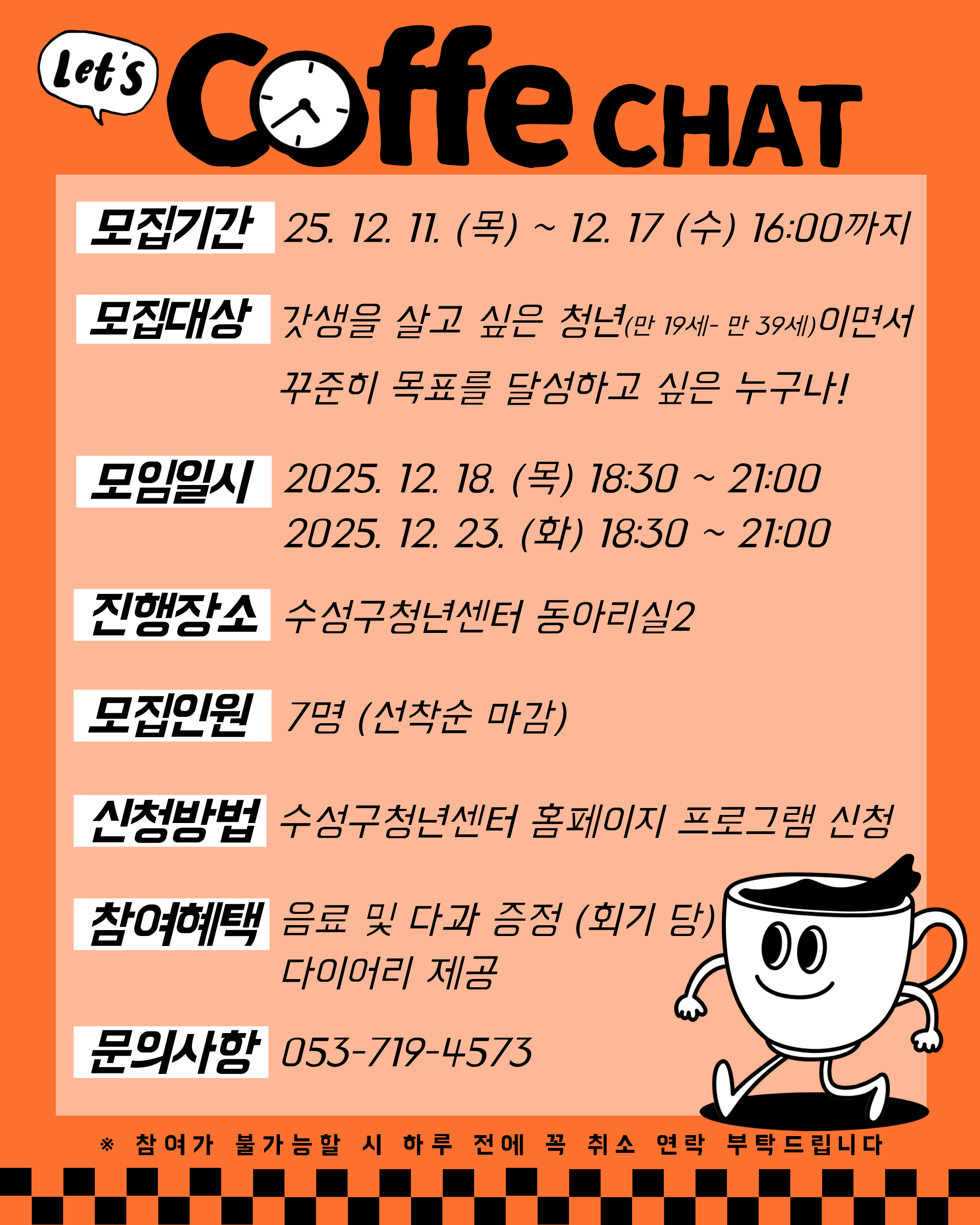 수성구청년센터에서 청년 모임을 위해 커피챗 동아리를 개설하였습니다!