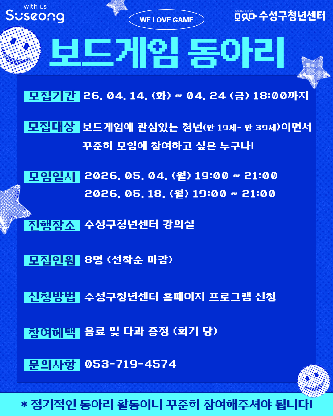 [ 수성구청년센터에서 보드게임 모임! 신규 동아리 원을 모집합니다! ]