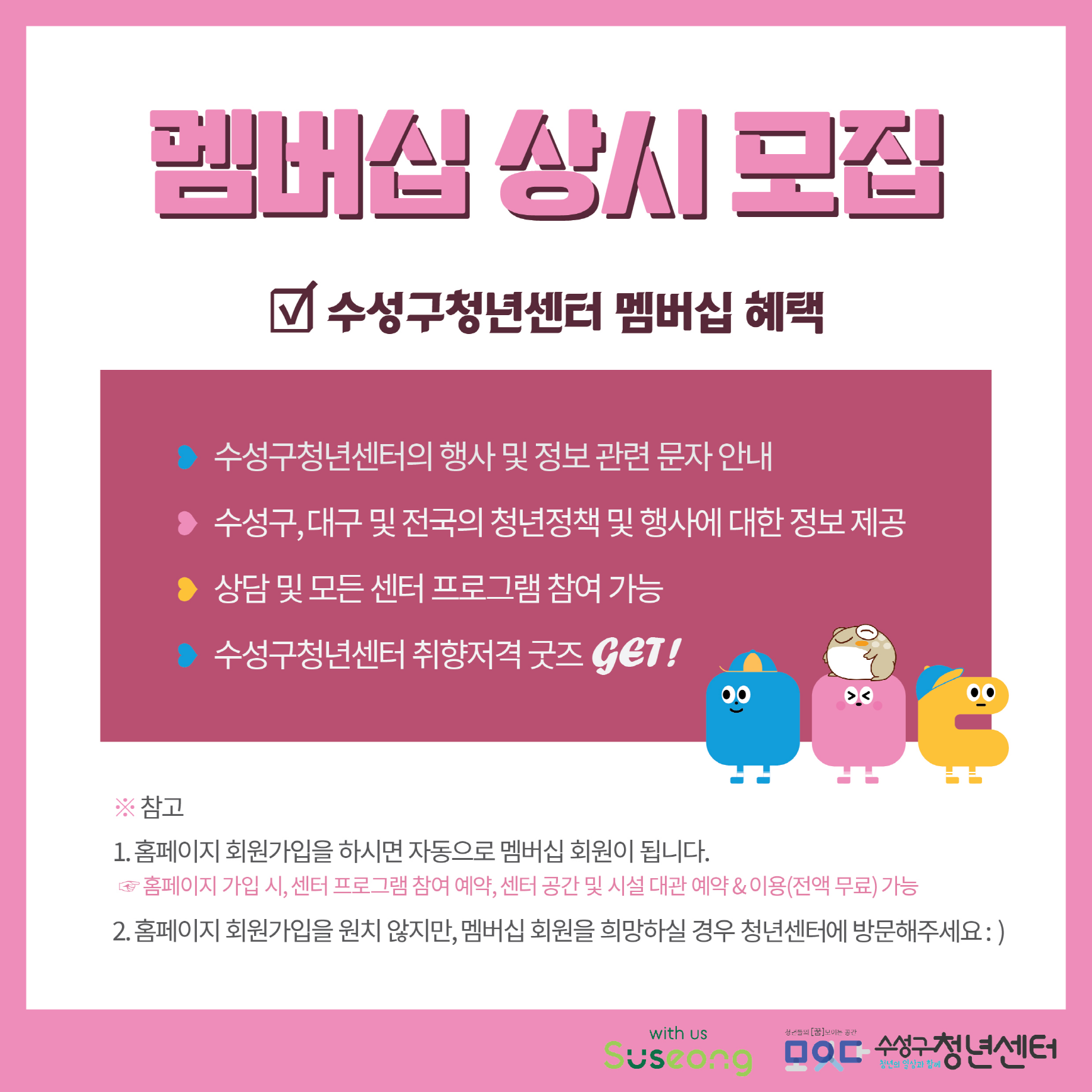 수성구청년센터는 '수성구청년센터 멤버십'을 상시 모집합니다.
