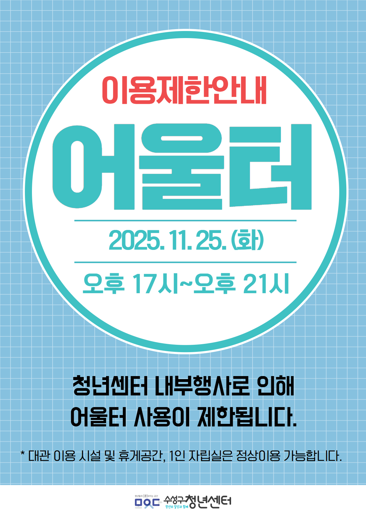 수성구청년센터는 이용자의 귀책사유로 인하여 노출된 이용자의 계정정보를 포함한 모든 정보에 대해서 모든 책임을 지지 않습니다.
