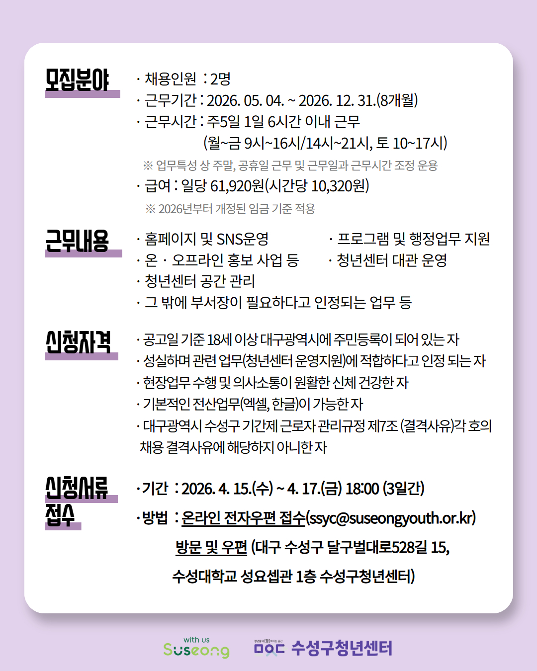연락처 : (전화번호)053-719-4574, (이메일)suseong_youth@naver.com, (팩스)053-719-4576