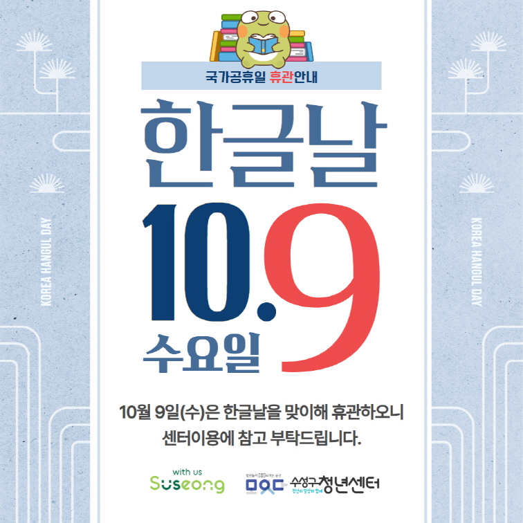 안녕하세요:) 수성구청년센터입니다 10월 9일은 한글날로 센터 휴관일이오니 센터 방문에 참고 부탁드립니다