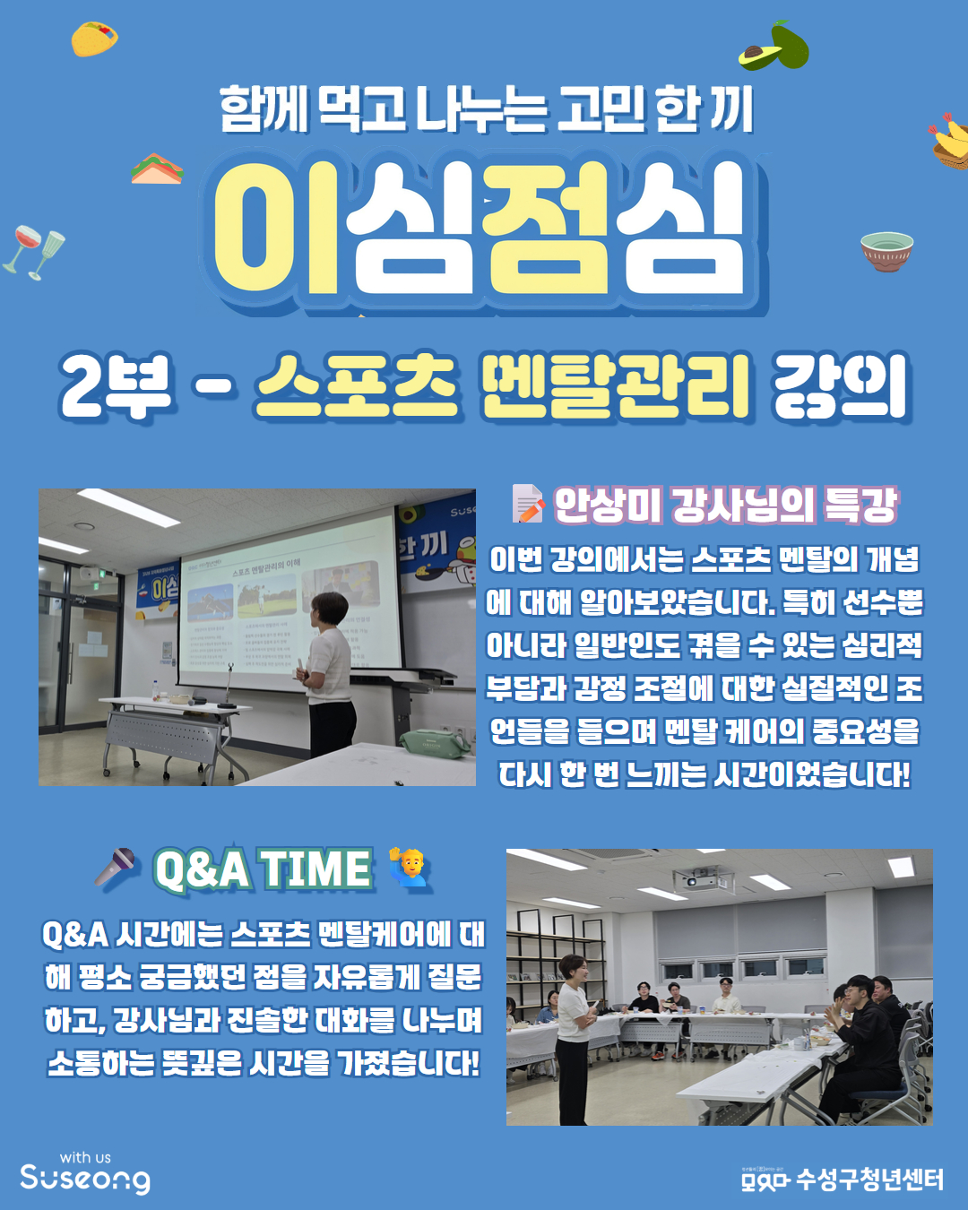 이번 강의를 통해 스포츠 멘탈의 개념은 물론, 일상 속에서 누구나 겪을 수 있는 심리적 압박과 감정 조절의 중요성에 대해 배울 수 있었어요.