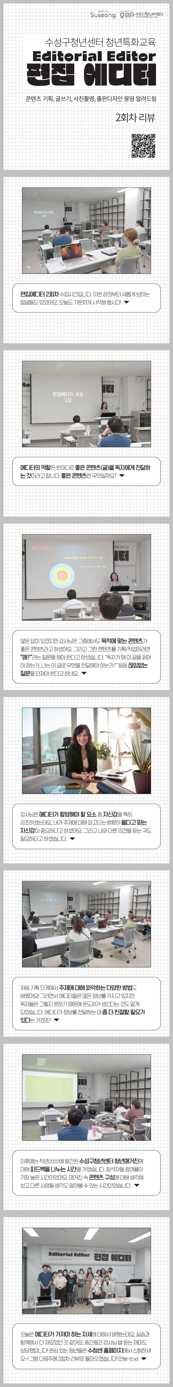 오늘은 에디터가 가져야 하는 자세에 대해서 배웠는데요, 실습과 함께해서 더 재밌었던 것 같아요. 중간중간 강사님 썰 듣는 재미도 상당했답니다! 관심 있는 청년들 은 수청센 홈페이지에서 신청하세요~! 그럼 다음주에 3회차 리뷰로 돌아오겠습니다! 안뇽~(End)
